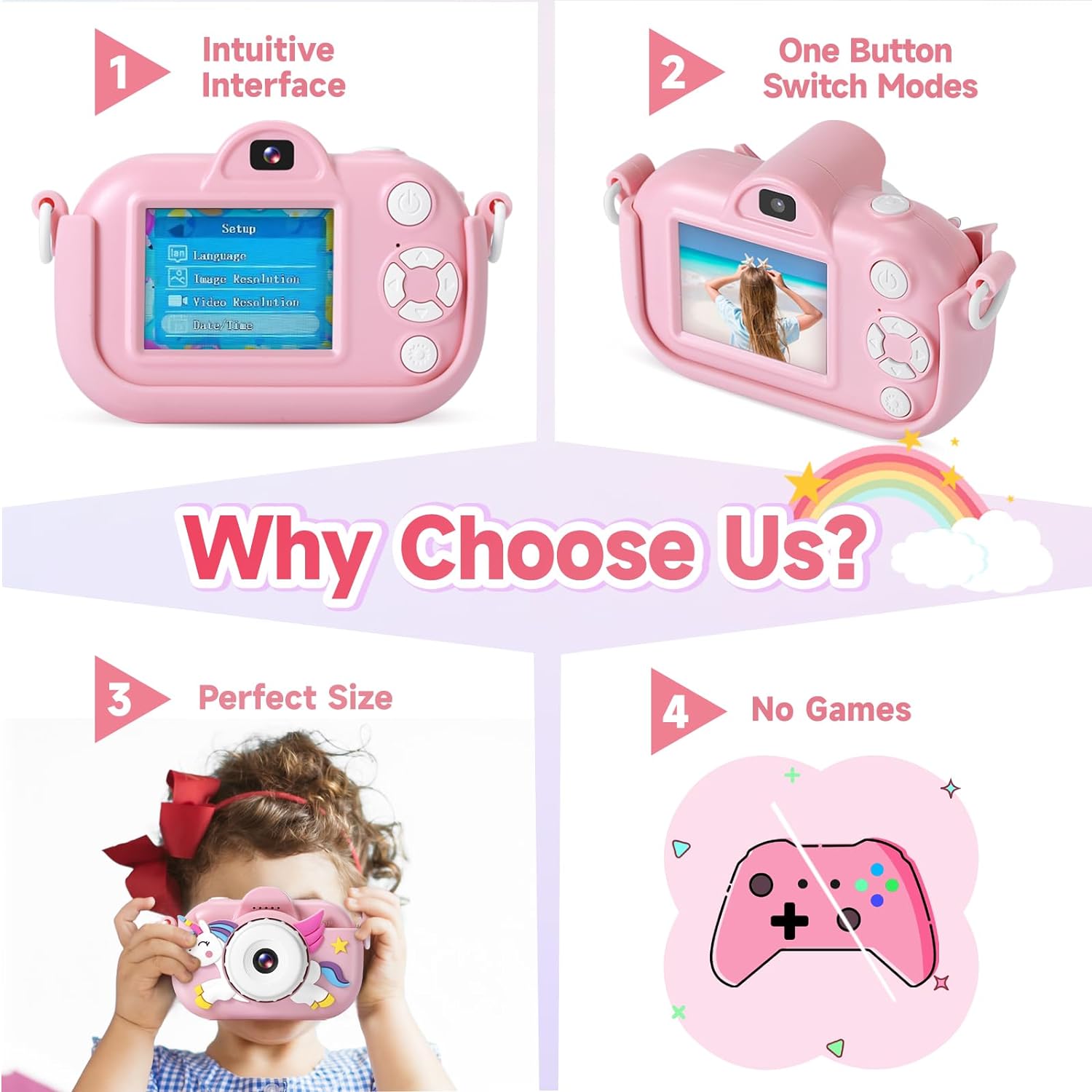 Kids Camera Toys for Girls Age 3-8, ZUODUN Kids Digital Camera Toddler Camera for 3 4 5 6 7 8 Years Old Birthday Gifts, 1080P Video Camera with Cute Protective Cover & 32GB SD CardCreate a new description for this product from the title with 500 characters